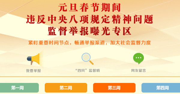 据中纪委监察部网站消息,元旦春节将至,为紧盯重要时间节点,驰而不息纠正“四风”,中央纪委监察部网站推出《元旦春节期间违反中央八项规定精神问题监督举报曝光专区》。