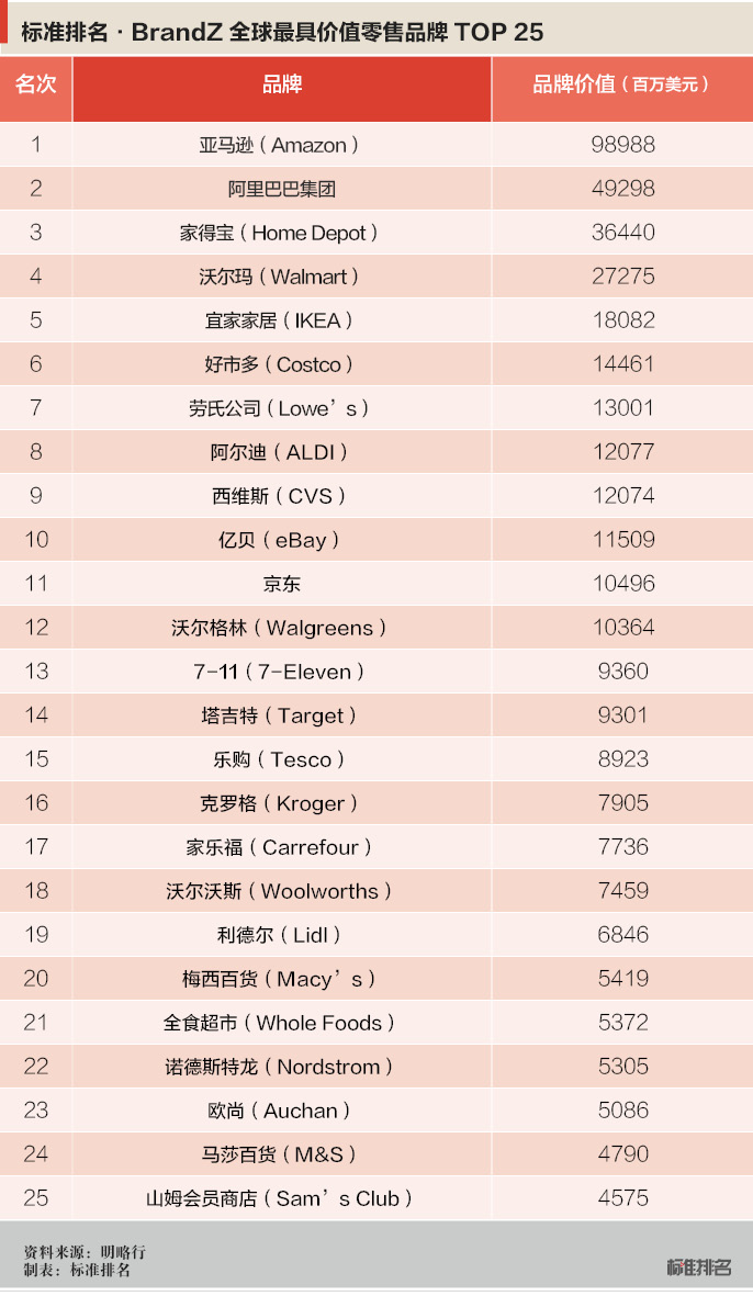 世界最大零售体、最近被美国贸易代表办公室列入“恶名市场名单”的阿里巴巴和全球领先的家居建材用品零售商家得宝紧随其后,分列第二、第三位。其中,阿里巴巴品牌价值较上一年度下降26%至492.98亿美元,家得宝增加32%至364.40亿美元。