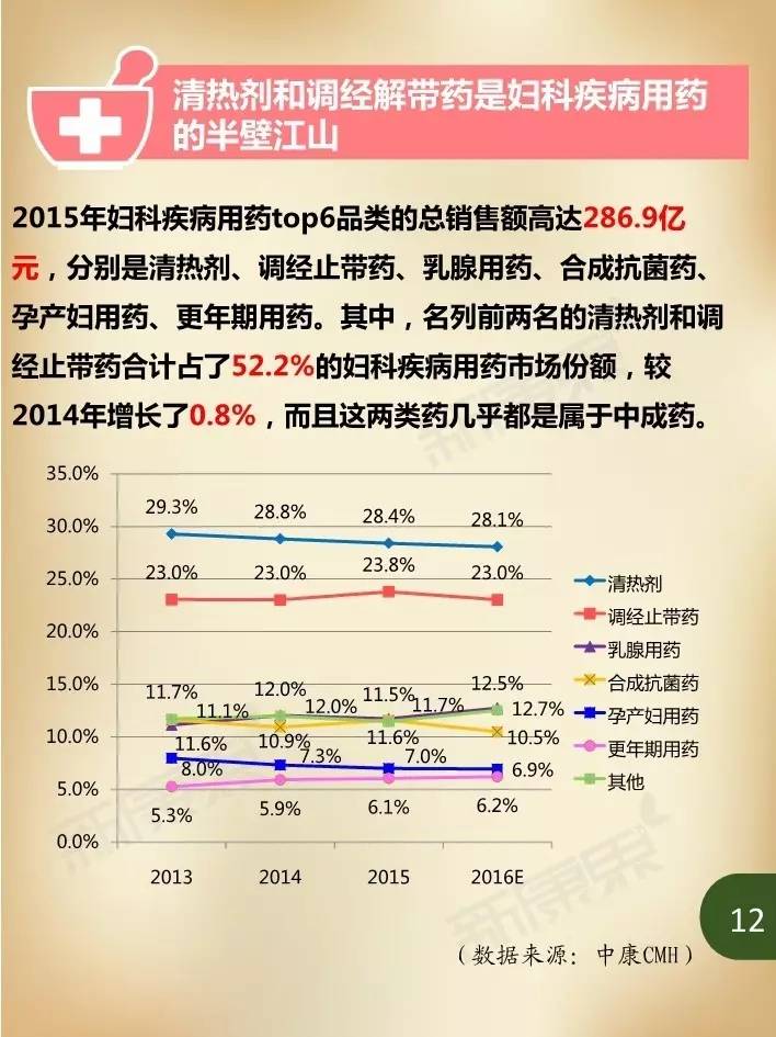 近年来,在我国妇女人口持续增加、妇科疾病患病率居高不下,以及大众健康意识不断提升等诸多因素影响下,国内妇科疾病用药市场规模持续保持高速增长。据中康CMH数据显示,我国2015年妇科疾病用药规模达324亿元,同比增长5.4%,占生殖泌尿系统和性激素类药物46.3%的市场份额,占我国药品市场2.4%的份额。估计2016年妇科疾病用药市场规模将在352亿元左右,比2015年增长8.9%。