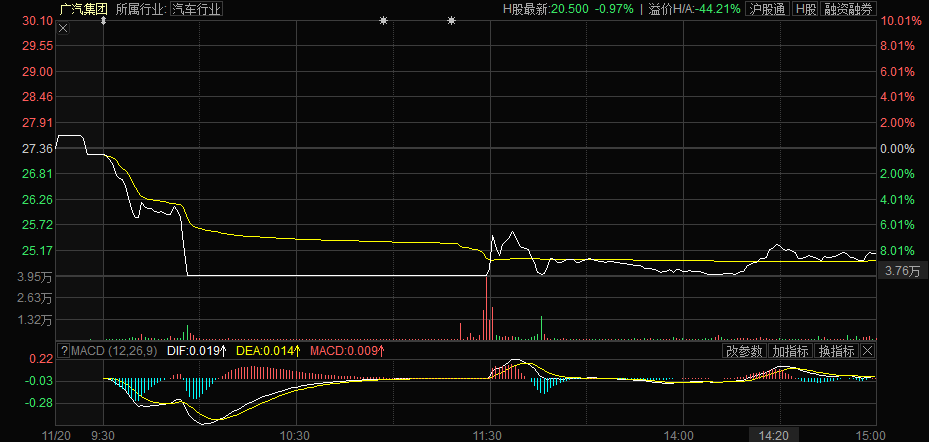 受广汽集团A股大跌影响,其H股同样收阴,报20.5港元/股,跌0.97%。盘中最大跌幅近7%。