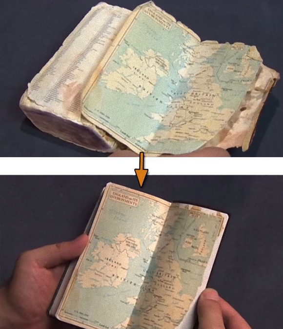 接着,将封皮里已四分五裂的地图重新黏在纸上,防止更大程度的破损。