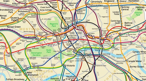 为回应伦敦市民对信息传播自由的要求,伦敦交通局绘制了下面这张地图。图上的地铁线路如面条般纷繁芜杂,交错纠缠。没错,它的确足够准确,至少一团乱麻般的北线就是现实的真实写照!但是原本清晰、粗线条的标志性轨道交通被取而代之,而现在这张图看起来让人直想挠墙。