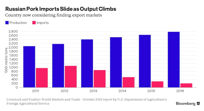 据彭博社报道,美国农业部数据显示,俄罗斯国内猪肉产量四年里增加了26%,创下了历史最高水平;与此同时,进口从2012年的峰值下降了超过80%。