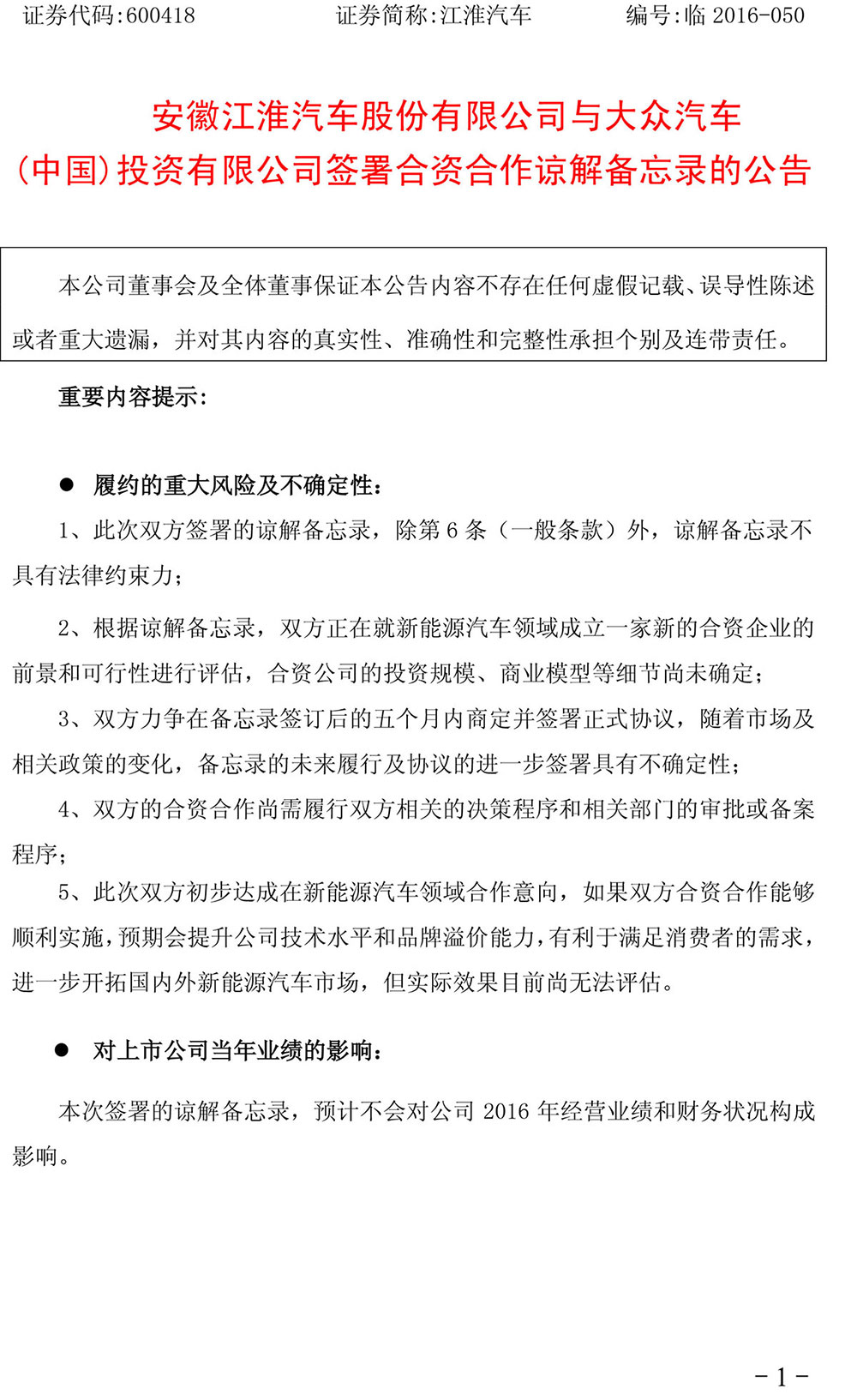 9月7日,江淮汽车发布公告称,该公司与大众汽车正在就新能源汽车领域成立一家新的合资企业的前景和可行性进行评估,合资公司的投资规模、商业模型等细节尚未确定。双方已在德国沃尔夫斯堡签署了该谅解备忘录,并力争在备忘录签订后的五个月内商定并签署正式协议。