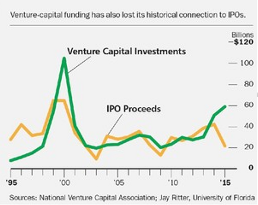 从2012-2014,平均每年有36 家风投投资的高科技公司IPO,可是到2015年降至23家,今年上半年硅谷仅有Twilio一家独角兽公司上市,下半年到目前为止也只有LINE一家独角兽上市。共享经济公司虽然风光无息,可是目前还没有哪家真正成功地把账面虚值转换成货真价实的市值。而投资界预测现在独角兽上市时至少估值要砍掉三分之一。