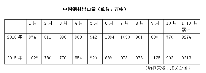 但10月钢材出口量暴跌,使得这一判断很有可能落空,当月770万吨的钢材出口量创下了过去16个月的新低。截至10月末,中国已累计出口钢材9274万吨,相比去年同期仅多出61万吨。