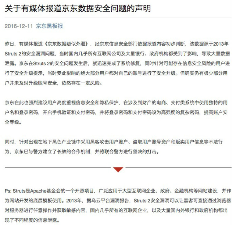 京东在12月11日凌晨发表声明,称该数据源于2013年Struts 2的安全漏洞,已经完成修复。