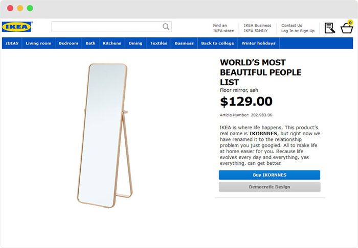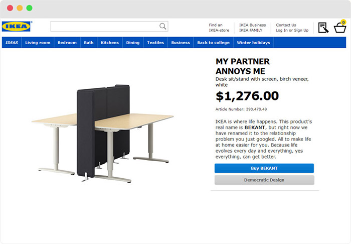 作为北欧三国之一的瑞典可能是世界上社交恐惧患者最多的国家,而出身于瑞典的宜家当然深谙社恐患者们的心理。最近,宜家推出了一个“治愈网站”ikearetailtherapy.com,将旗下产品统统换了名字,用家具道出生活中我们不忍点破的心酸。