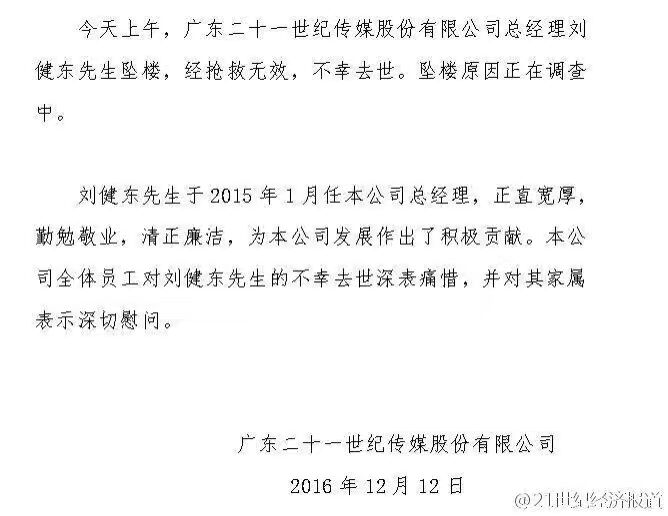 根据《21世纪经济报道》声明,今天上午,广东二十一世纪传媒股份有限公司总经理刘健东坠楼,经抢救无效不幸去世。坠楼原因正在调查中。