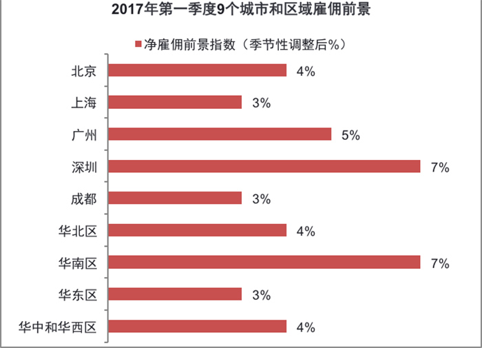 万宝盛华将大陆地区归类为对5个城市(北、上、广、深、成)和4个区域(华北区、华东区、华南区、华中及华西区),其中华南区与深圳的雇主雇佣前景最强劲,净雇佣前景指数为7%。上个季度这两个区域就是跳槽最容易的地方。而华东区、上海与成都的招募预期相对最弱,净雇佣前景指数3%。与去年同期相比,华东区与上海的净雇佣前景指数下降了3个百分点,成都下降了2个百分点。