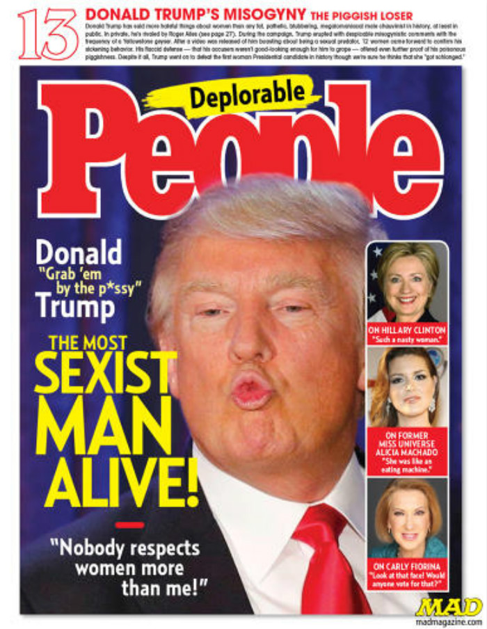 这期研究了过去一年中特朗普最为荒谬的四个举动。他们模仿《人物》杂志“本年度最性感男士”的封面创意,提名特朗普为“可悲人物”杂志“尚且活着的最性感男士”。