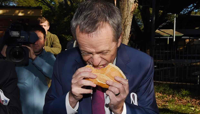 在一张图片中,澳大利亚工党领袖比尔·肖滕正展示自己从中间咬开面包的技巧(“尝起来有民主的味道”,他说道),这也是投票站前最有代表性的图片之一。