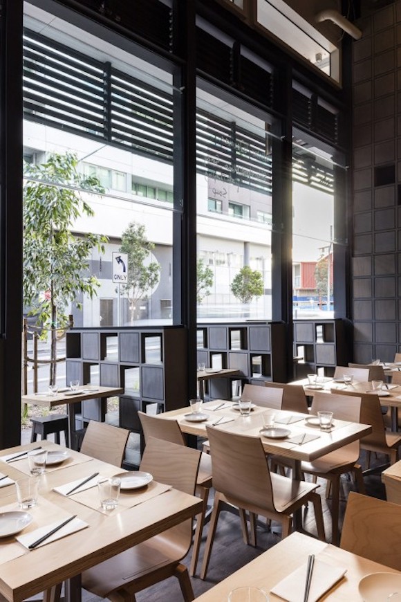 最终,Faced Studio决定在第二种方法的基础上,寻找店铺开放与封闭的平衡。建筑师想到的是用模块化的置物架搭建外墙。这样的外墙有一个个小“窗口”,让外界和餐厅内看似分隔却又相连。