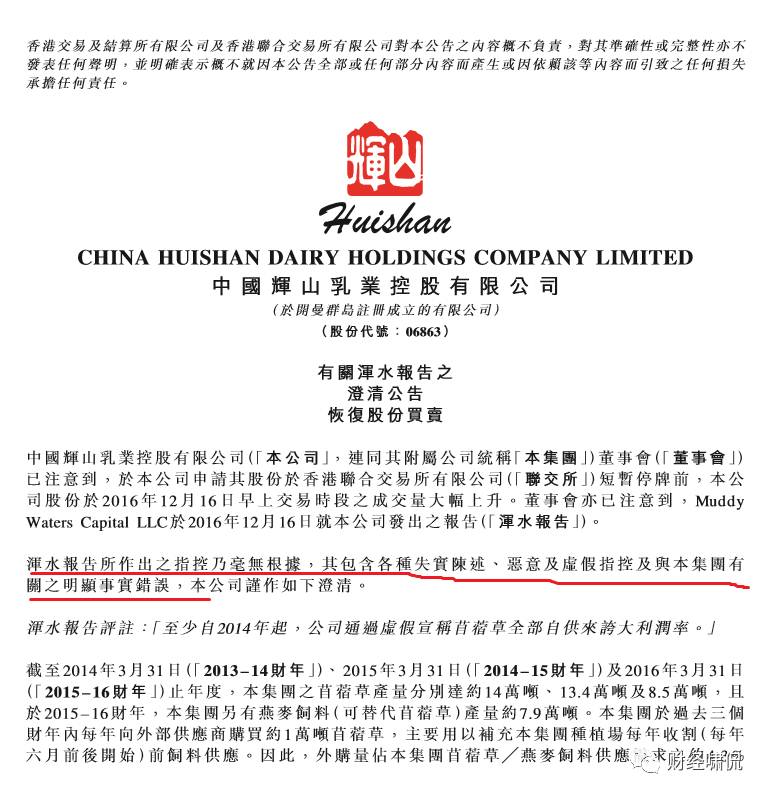 辉山乳业方面在公告中称,浑水报告声明发表者【在沽空】公司证券,据此,本公司认为发表者可能从本公司证券价格的下跌中获利。“本公司保留就该报告相关事宜采取法律措施之权利(包括提起诉讼的权利)”。