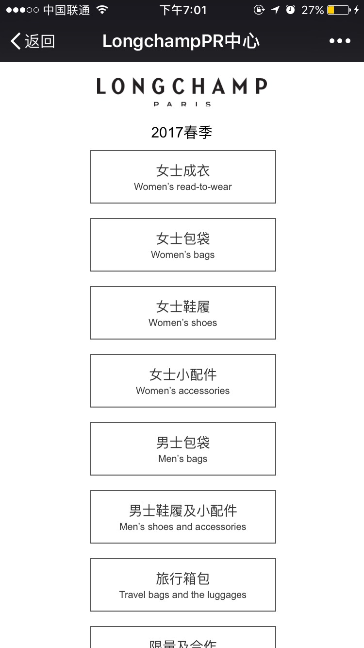 而Longchamp珑骧的微信媒体中心,就是顺应当下用户习惯而生的:“我们把媒体一样看作是消费者,现在绝多数消费者都已经非常依赖手机和微信了,有了这个微信媒体中心,媒体和相关从业者不需要特意跑到电脑前发邮件、或者在PDF上截屏这么繁琐了,也无需下载app就可以向我们申请借取样品了。”Josephine Liang对界面新闻说。