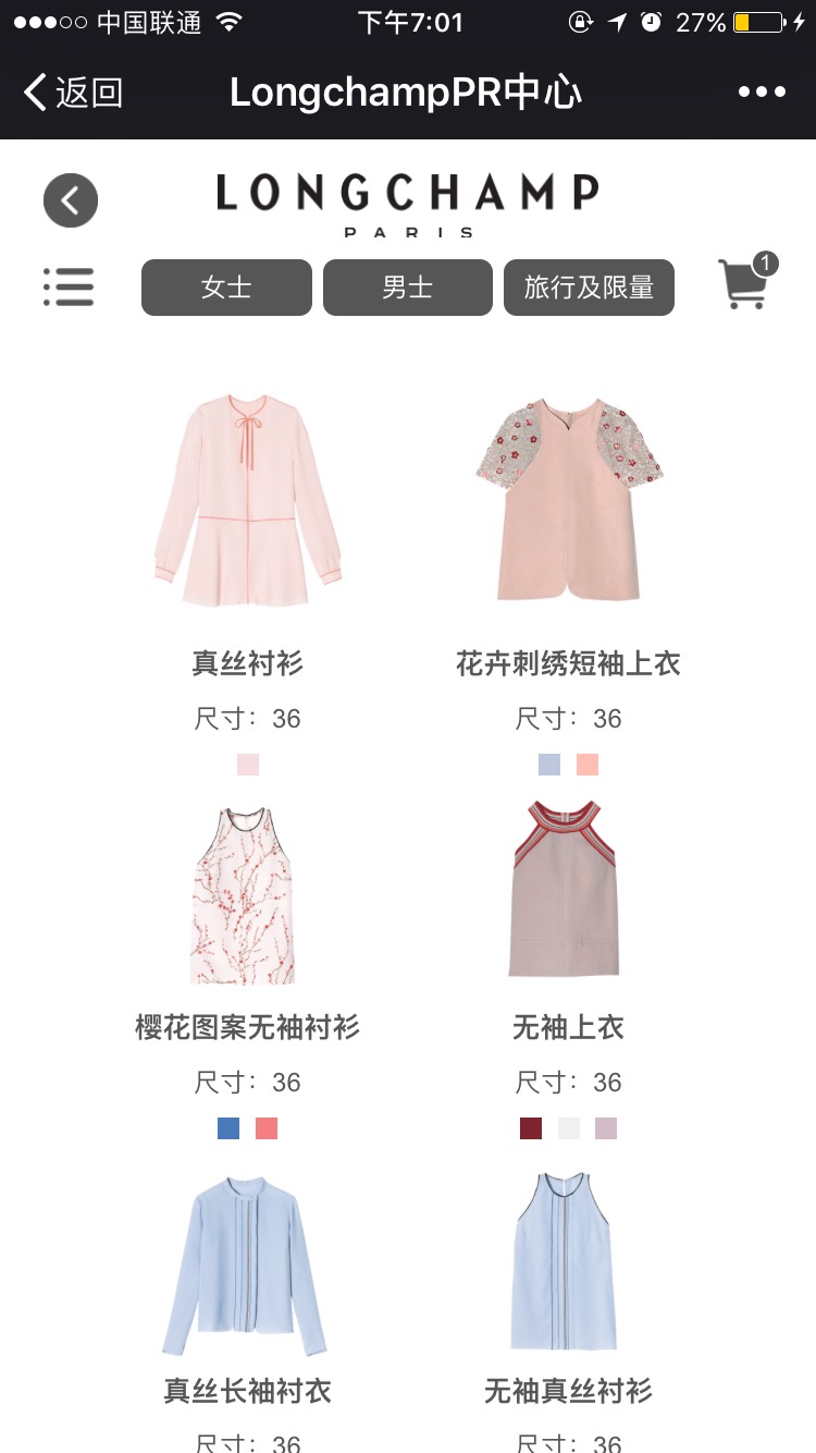 主界面比较像是一个经过优化的手机端电商页面,Longchamp珑骧旗下的女装、男女包袋、鞋履及配饰等分支系列被细化至8个子目录。点击进入相应子目录,即可看到品牌新一季中国内地区可供借拍的产品静物图、中英文产品名、描述以及可选颜色、尺码等信息。