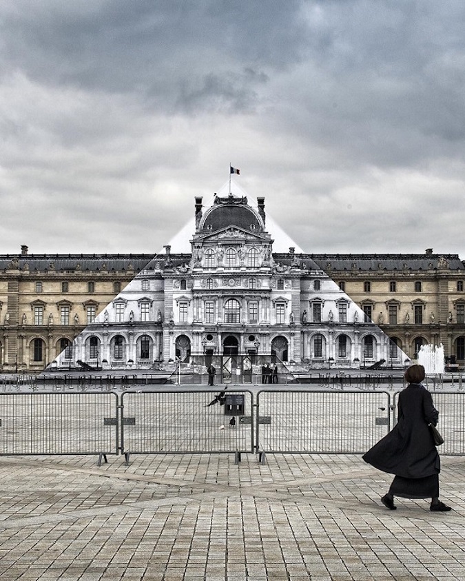 利用摄影技术,法国街头艺术家JR让巴黎卢浮宫前著名的玻璃金字塔消失了。当从一个精确的角度看过去,金字塔真的不见了,我们得以见到卢浮宫惊人的“真面目”。