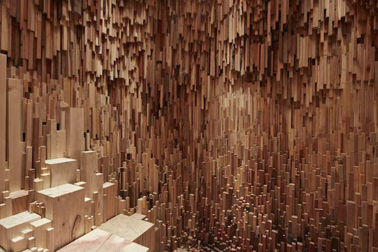 空心这个交互式装置是艺术家Katie Paterson和建筑家Zeller & Moye的作品。该作品由10000多块跨越百万年的木材制成。它们被切成木板,之后雕成钟乳石的形状,挂在天花板上,为参观者听过独特的,步行参观体验。
