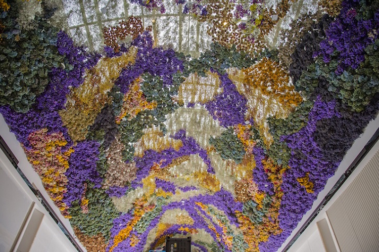 艺术家兼园艺爱好者Rebecca Louise Law整合了自己的两大兴趣,做出了一个顶棚。它是由15万美丽明亮的澳大利亚花组成的。用铜线和多样的绽放的鲜花,Law装点了墨尔本伊斯特兰购物中心的天窗。