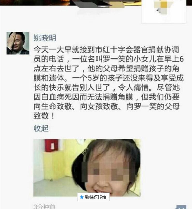 24日早上,市政协委员、原市眼科医院角膜及眼表病区主任、眼库执行主任姚晓明微信发布消息称,罗一笑在今天早上6点去世,她的父母希望捐献她的遗体和器官。
