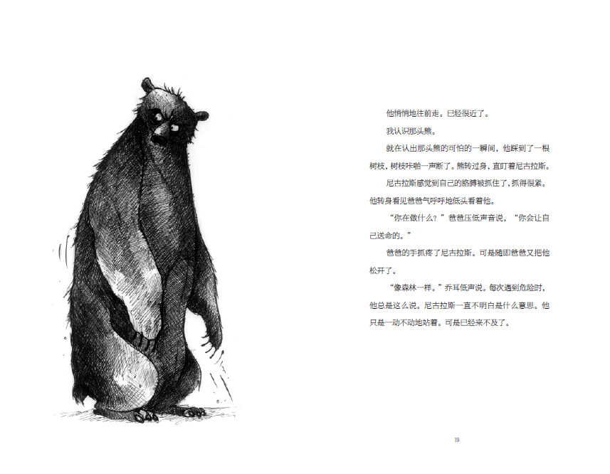 尼古拉斯注视着把斧头攥得更紧的爸爸,他看见爸爸的手在发抖。爸爸把尼古拉斯拉到自己身后,生怕大熊朝他们扑来。