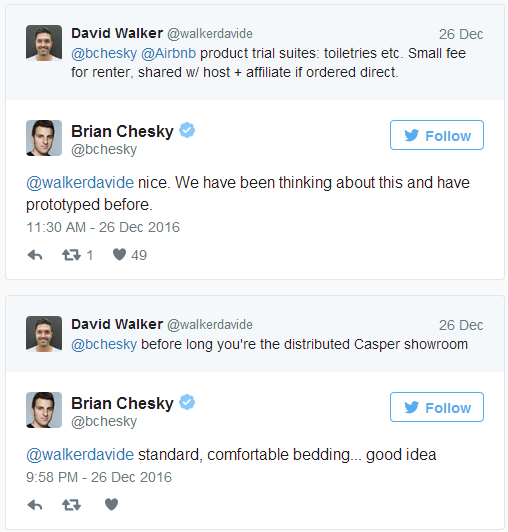 一个粉丝建议Airbnb为房东提供展示消费用商品,比如Casper床垫。Chesky很好奇: