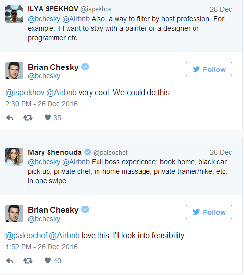 各种建议涌现,现在超过了1000个了。Chesky回复了十几个给出建议的网友,称赞他们的想法,询问更多的细节,或者友善地告诉他们Airbnb是否已经在完成他们的愿望。尽管有些风言风语称Airbnb违反了一些城市的法规和有歧视他人的房东等问题,但大部分的建议都是来自房东和房客的,他们希望网站的服务能有一些调整,Chesky看起来很高兴去考虑这些建议。