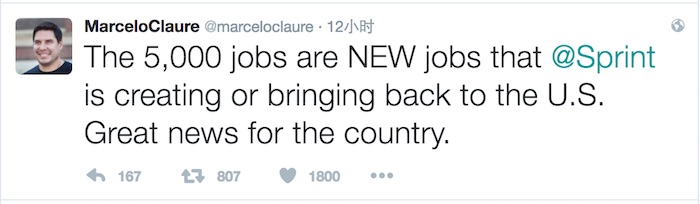 不过,Sprint首席执行官 Marcelo Claure周四发布推文称,这5000个就业是Sprint将要创造或带回到美国的新就业,“对国家来说非常好的消息”。