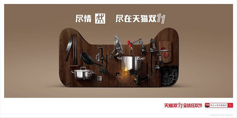 双立人品牌方将自家的厨具摆在了天猫形状的砧板上,体现了双立人厨具的使用场景。