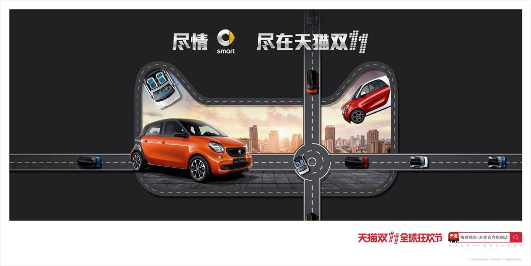 Smart品牌将天猫形象轮廓设计成了道路,整个海报更增添许多动感。
