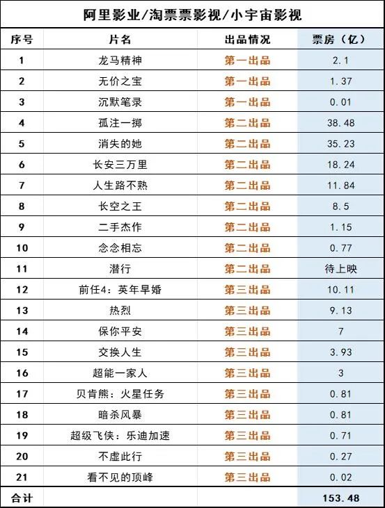 不过相比传统电影公司的内容布局,作为互联网电影公司的阿里影业还是稍显稚嫩,三部第一出品项目的票房产出能力都比较平庸,还有一定提升空间。