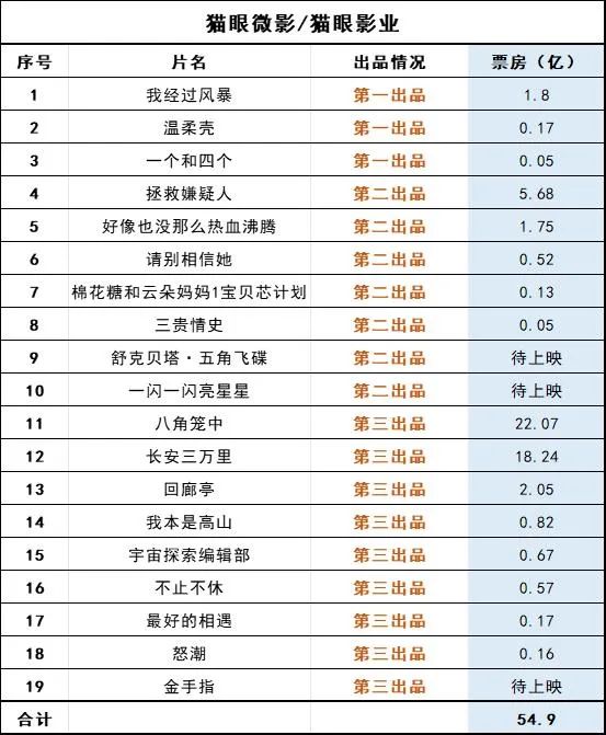 今年猫眼的三部主控影片累计票房才将将突破2亿大关,不过好在广泛的内容布局依然能够成为猫眼影业的底牌。像其第三出品的《八角笼中》《长安三万里》均在暑期档取得了优异表现,而接下来的跨年档,猫眼也将有一部刘德华、梁朝伟主演的港片《金手指》等待与观众见面。