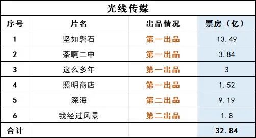 光线传媒在2023年的表现还是一如既往地稳健,主控出品了《坚如磐石》《茶啊二中》《这么多年》《照明商店》四部影片,同时作为第二出品方参与了备受观众期待的动画电影《深海》以及首部反家暴题材影片《我经过风暴》。