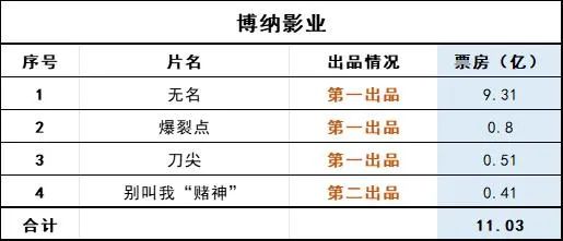 尽管今年博纳的四部主要出品项目中有三部都是主控影片,然而只有一部春节档的《无名》表现优异斩获9.31亿元票房,剩余的《爆裂点》《刀尖》两部第一出品影片和由博纳第二出品的《别叫我“赌神”》甚至难以破亿。