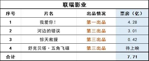 除了这部影片之外,联瑞也以第三出品参与了《河边的错误》《惊天救援》和即将在年末上映的动画电影《舒克贝塔·五角飞碟》三部中等体量项目。
