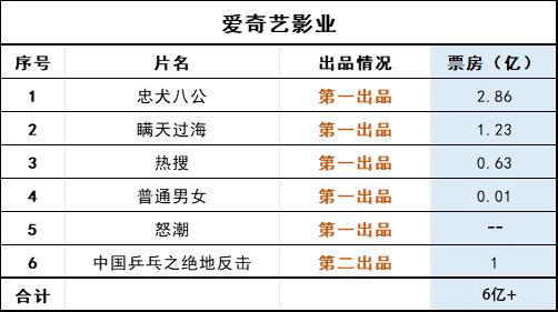 今年爱奇艺影业继续坚持着着重主控出品的大原则,作为第一出品方出品了5部影片,作为第二出品参与了春节档影片《中国乒乓之绝地反击》。其中表现最好的《忠犬八公》在清明档上映获得2.86亿元票房,其余几部影片除了《怒潮》还未上映以外,均未能突破2亿元关口。
