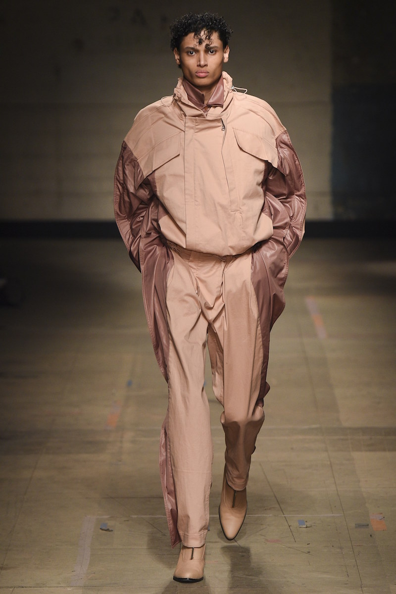 这也是延续了去年超厚型羽绒服的风潮,Marques’Almeida、Acne Studio、Peng Chen的羽绒服在各大社交平台上大火特火,可谓是实用性和时尚一次人性化的结合。系列中和Feng Chen Wang春夏季的“数字时代”类似的部分有羽绒服背后的交织节点和飘带设计,以及裤子还是类似防水服材质。