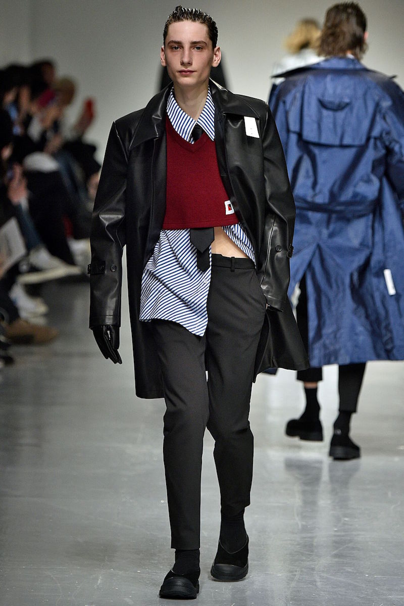和去年动不动就把大衣卡到肩膀以下的造型相比,这一季的人们又开始好好穿衣服了。虽然秋冬系列延续的依然是春夏时关于“成人”的主题,但它们之间还是有一些差异,比如模特们头上顶着的帽子很像中国古代进京赶考的书生,脚上穿的也像是黑色布鞋,这些东方元素第一次在Xander Zhou这里变成了显性基因。