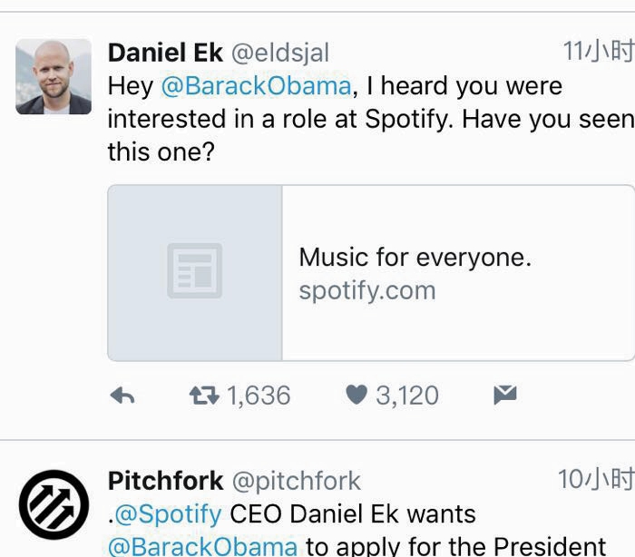 周一,Spotify首席执行长Daniel Ek发推文询问奥巴马是否看到了该公司的招聘启事。Ek写道,他听说奥巴马有兴趣在Spotify谋得一职。Spotify有逾4,000万付费用户,知情人士称,该公司正争取在今年晚些时候进行首次公开募股。
