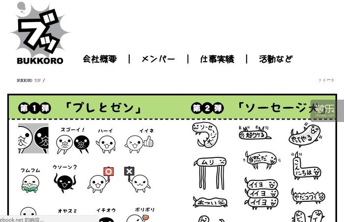 (BUKKORO的官网首页。除了这个页面和公司人员介绍以外,其他的页面都是空白的。为什么这些贴纸长得像《太鼓的达人》呢?因为横尾曾经在南梦宫呆过,而“宰了你哦”的员工之一也曾经担任过《太鼓的大人》的角色设定)
