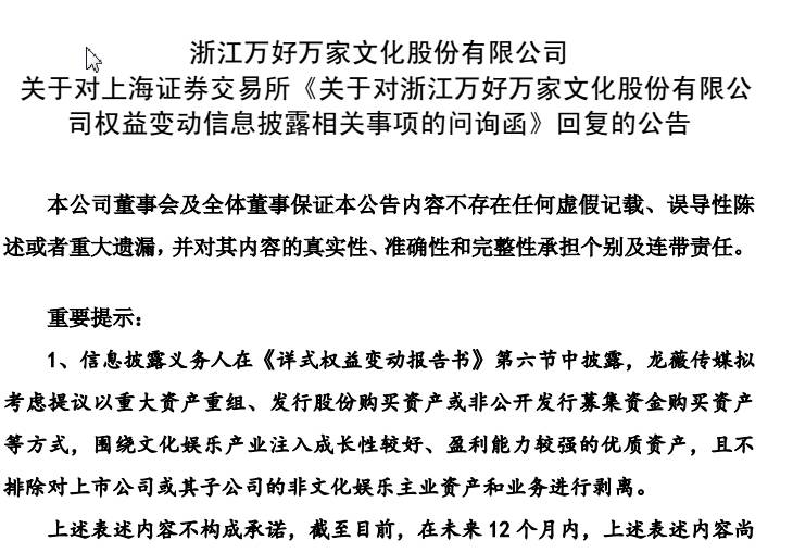 因此,龙薇传媒否认有关重组的说法构成承诺,“截至目前,在未来12个月内,上述表述内容尚无明确的计划和时间安排,亦无意向标的或谈判对手方,仅为信息披露义务人表达为全体股东带来良好回报的意愿”。