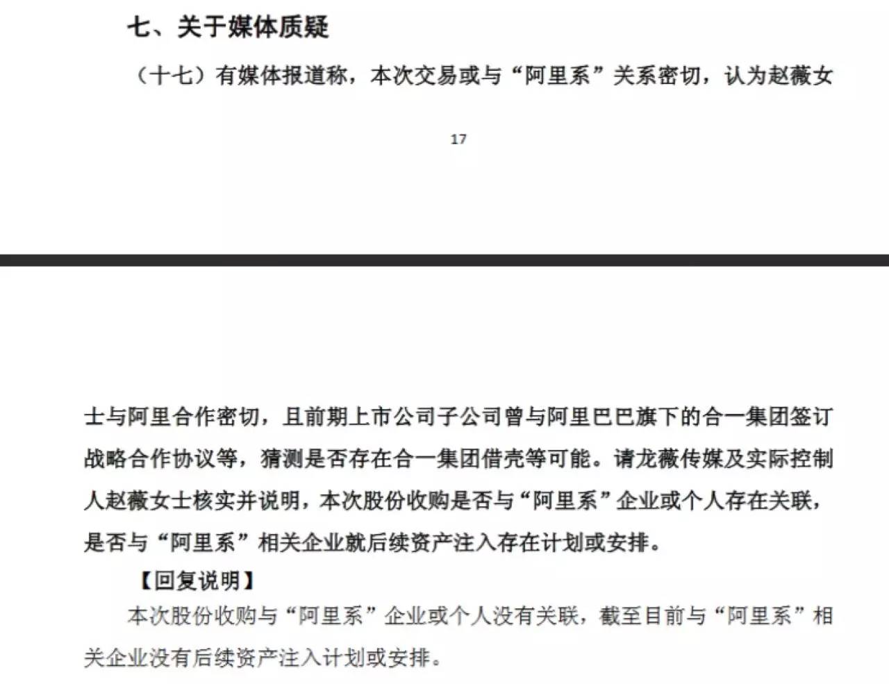 根据之前公告的说法,龙薇传媒上位后,将围绕文化娱乐产业注入成长性较好、盈利能力较强的优质资产,且不排除对上市公司或其子公司的非文化娱乐主业资产和业务进行剥离。市场上对于赵薇将注入什么文化娱乐类资产到万家文化中,尤其是对于阿里旗下的合一集团是否借壳万家文化抱有很大的期待。上交所的问询函中也要求赵薇和龙薇传媒说清楚与阿里的关系,是不是承诺一定会重组,重组期限和具体安排是怎么样的,如果没能履约又该怎么办。