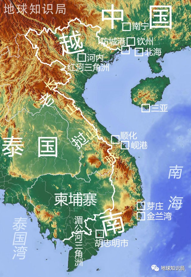 越南地形大概分为三个重要部分,北部的红河平原,中部的山地丘陵,南部的湄公河三角洲。红河和湄公河两条大河形成的肥沃冲积平原,为水稻种植业提供了得天独厚的条件,湄公河三角洲也成了东亚农业单产最高的地区,越南养活近一亿人口(九千万)才成为可能。中间山脉+两边平原如同一根扁担挑两个米筐。总体上,越南的政治中心在红河平原,经济中心在湄公河三角洲。