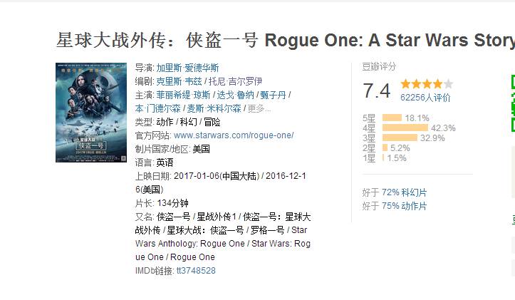 《侠盗一号》虽然在进入内地第一天起,票房表现就不是特别出色。但首日6822万的票房和7.7的豆瓣评分,外加北美市场三连冠,众多标签让这部影片看上去更像是一部能持续火爆的现象级大片。