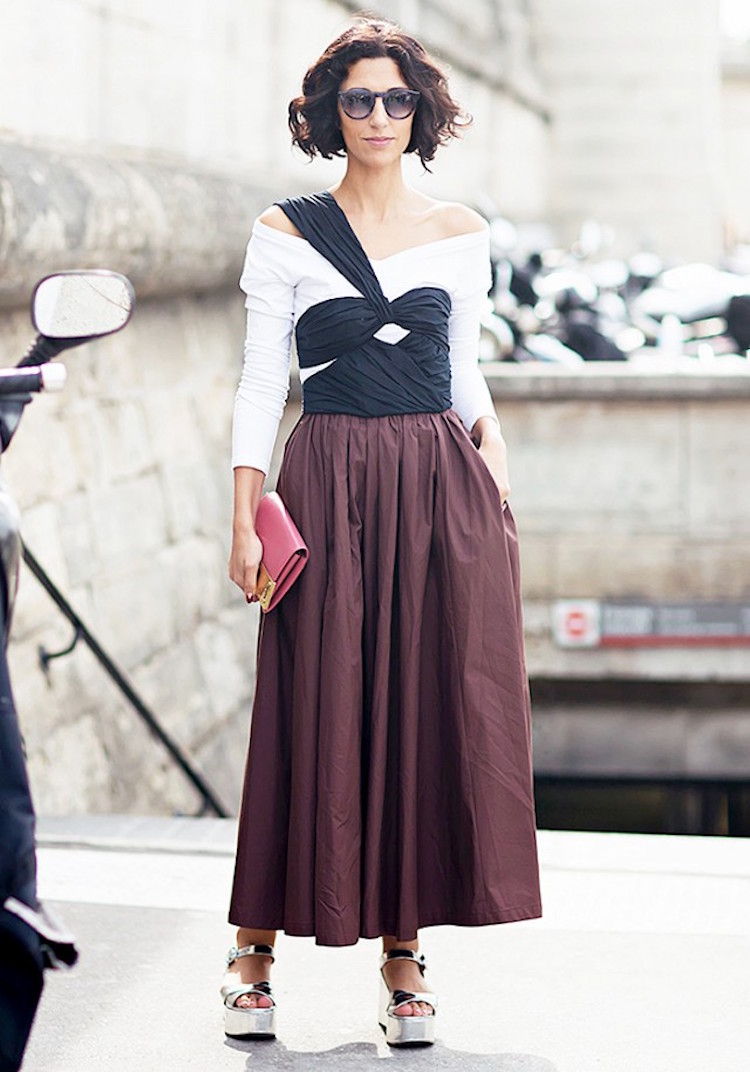 如果想购入不对称的下装就要参考上面秀场上不对称裙。除了飘逸的长裙之外还有许多不对称的包臀裙在显露诱人的身体线条同时也不会觉得呆板且一成不变。不过如果想追求优雅气质的话,一条不对称下摆的长裙就是必须要买入的了。