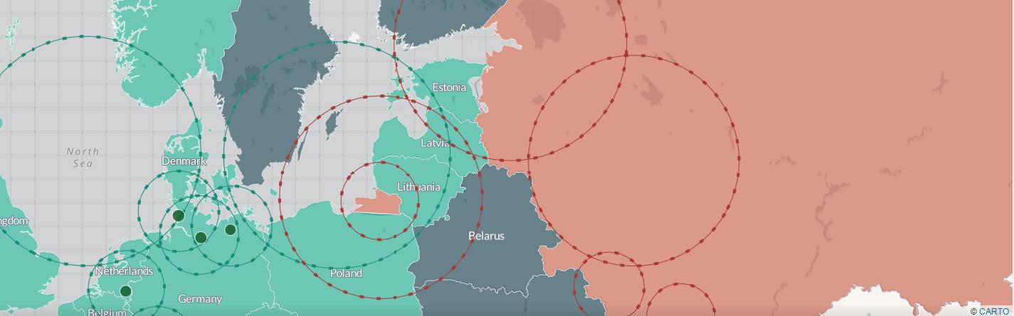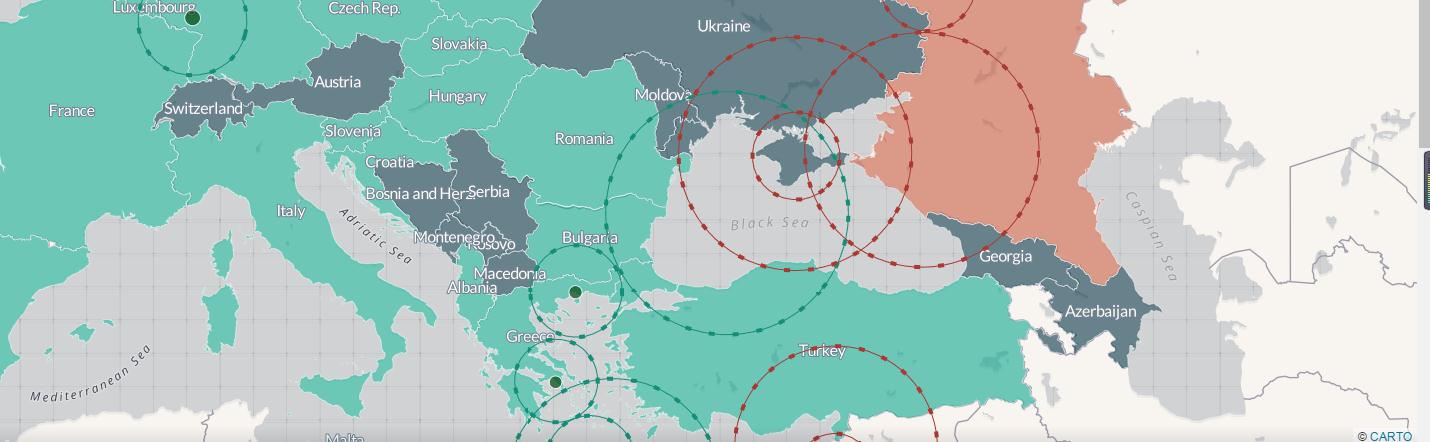 这张交互式地图可使读者更为直观地了解相关的情况:其中的“气泡”状图示标明了部署在欧洲的各类武器的射程范围。此图由位于华盛顿的智库“战略与国际问题研究中心”(Center for Strategic and International Studies)制作。(原图地址:https://csis.carto.com/me)