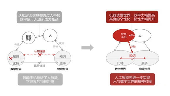 现在我们每天从智能机可以看到图片、信息、可以听到语音、可以在网上购物,但是这些信息对于机器只是0和1的比特流,所有的认知如图片的内容、语音的内容、文字的理解等,都需要通过人来处理,如在相册中寻找照片,我们需要逐张寻找;购物过程中我们需要去寻找哪种商品。这样的效率非常低下,低下的原因就是机器没有认知能力,所有认知方面的信息都需要人的周转。人工智能就是提升系统的认知能力,看懂世界、听懂世界、理解语音和文字,只有这样数字世界和物理世界才能实现认知连接,知识不需要从人进行周转,而是机器自己处理,这样大大提升人机效率。