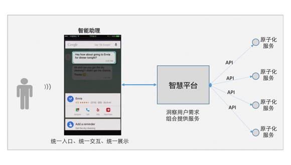 从上面APP的困扰可以看出用户需要的是功能和服务,而不是APP,而且用户入口越少,用户越容易操控。随着人工智能的注入,智能助理+智能平台将解决这个问题,并将颠覆现在的商业模式: