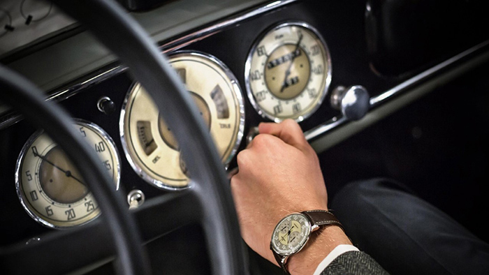 这一全新系列腕表的设计灵感,来源于上世纪充满怀旧魅力的经典汽车,品牌持有人Steim家族的收藏。手动小三针的表盘,很容易让人联想到汽车仪表盘上的速度计,别具一格的渡漆设计,彰显凸面表镜的三维特征和腕表的怀旧魅力。夜色中,表盘上的大号数字时标和加粗指针设计分外耀眼,可提供最佳的可读效果。垫厚和撞色线缝的皮制表带同样反映出腕表和汽车之间的紧密联系。大师系列驾驭者计时码表的酷似车速仪表的表盘设计完美再现了这一经典汽车配件的无限魅力。该款腕表的机械机芯支持秒表功能,在只允许机械计时的汽车公路赛中可与沙漏巧妙搭配使用,从而协助驾驶者实现对时间的精确掌控。