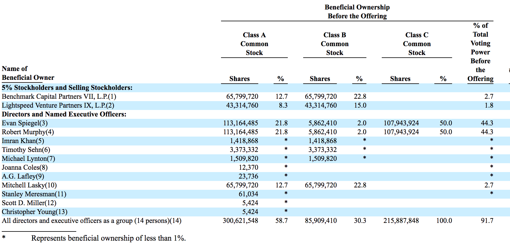 Snap的两位创始人CEO Evan Spiegel和CTO Robert Murphy平分全部的C类股票,再加上各自2%的B类股票,每人都拥有44.3%的投票权,以保证Snap公司的决策权不会旁落。